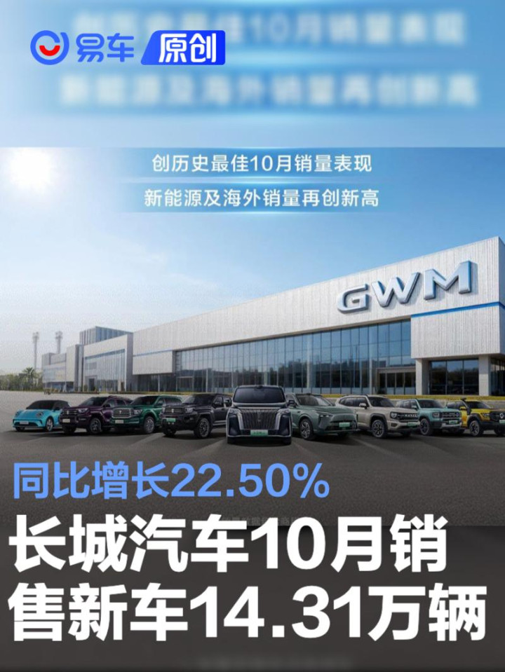 易车讯日前,长城汽车公布最新销量数据。2025年10月,长城汽车销售新车143078辆,同比增长25.5%。1-10月,长城汽车销售1066436辆,同比增长9.87%。