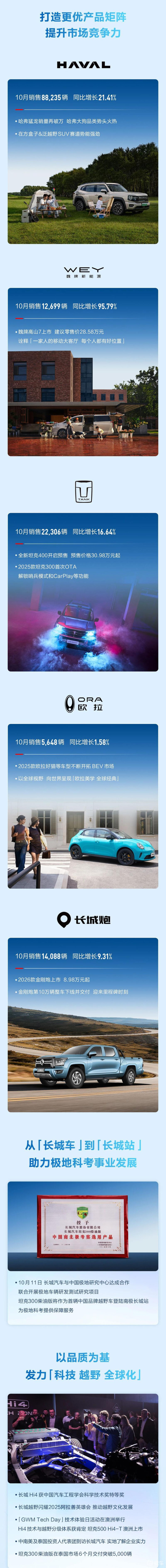其中,哈弗品牌10月销售88235辆,同比增长21.41%。魏牌新能源销售12699辆,同比增长95.79%。坦克品牌销售22306辆,同比增长16.64%。欧拉品牌销售5648辆,同比增长1.58%。长城炮销售14088辆,同比增长9.31%。