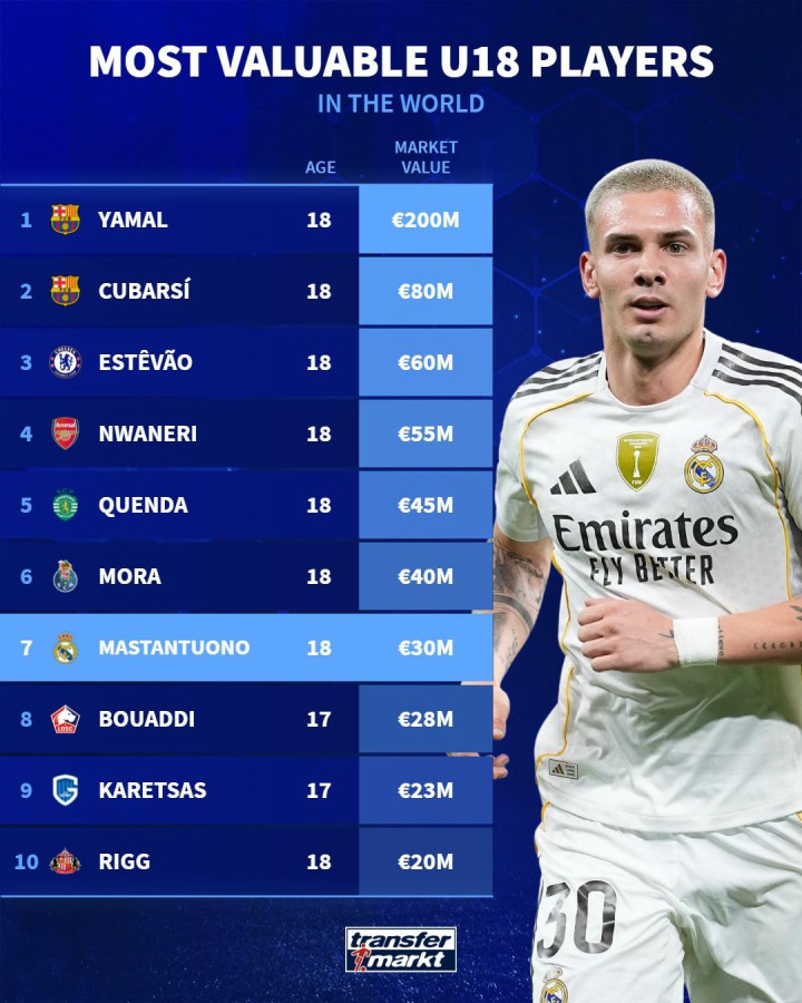 虎扑10月01日讯德国转会市场盘点了身价最高的10名年龄在18岁及以下的球员,详情如下:
