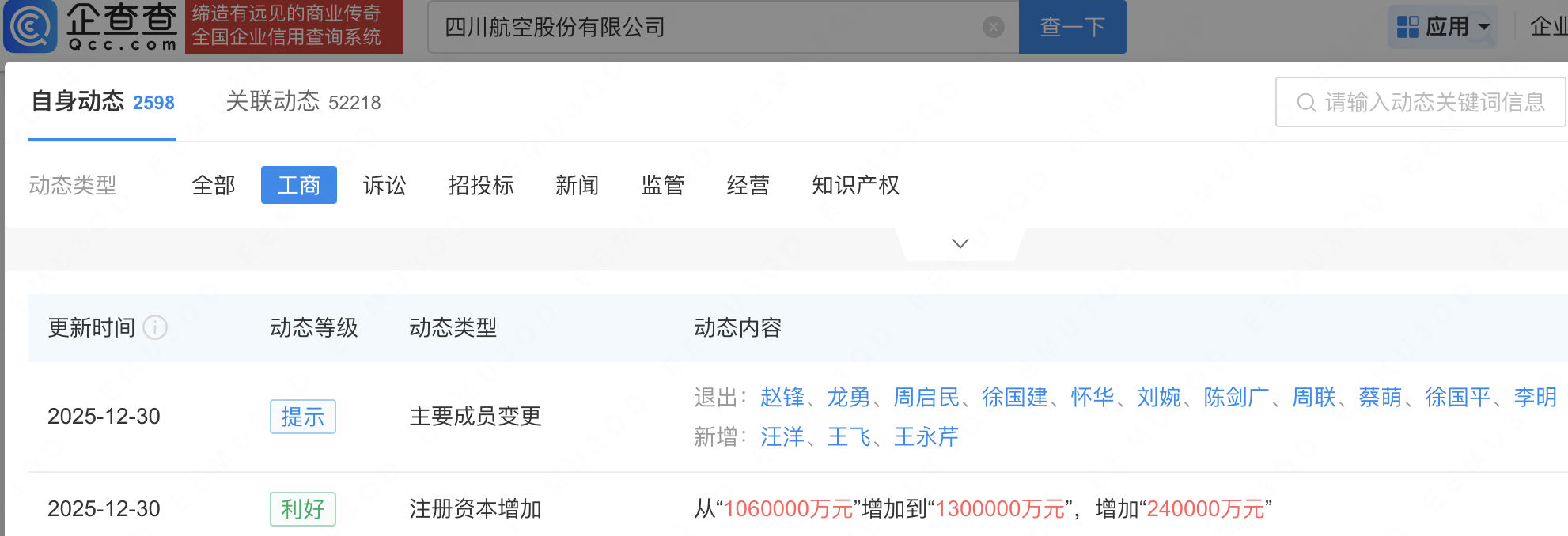 近日,四川航空股份有限公司发生工商变更,注册资本由106亿元增至130亿元,同时多名高管变更。企查查信息显示,该公司成立于2002年,经营范围包含:国内(含港澳台)、国际航空客货运输业务;普通货运;航空器/机体、航空器部件、特种作业维修等,由四川航空集团有限责任公司、南方航空(600029)、中国东航(600115)等共同持股。